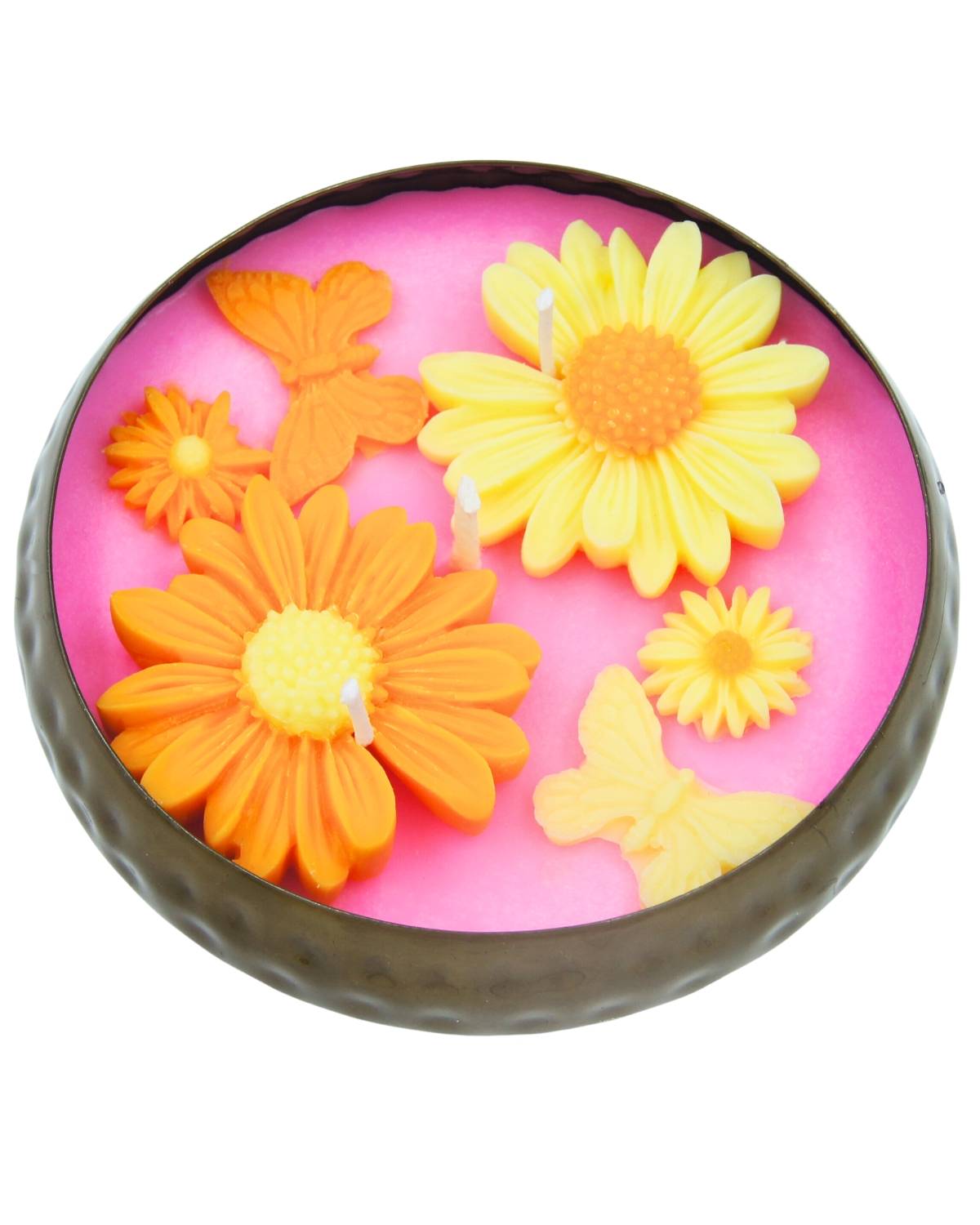 These beautiful aroma candles comes in a premium brass container, release a blend of elegance and tradition. The candle’s surface is decorated with 100% soy wax sunflowers and butterflies  orange and yellow in color. The gentle color tones of the flowers and butterflies rest against a smooth pink colored soy wax base, creating a visually soothing and fantastic aesthetic. The antique brass containers are adding a rustic and luxurious touch, making this candle both a fragrant and decorative masterpiece. Perfect for enhancing the ambiance of Bedroom, Living Room with its calming aroma and creative floral design.